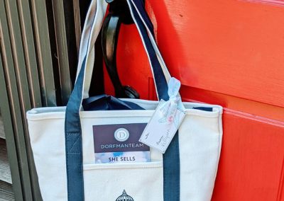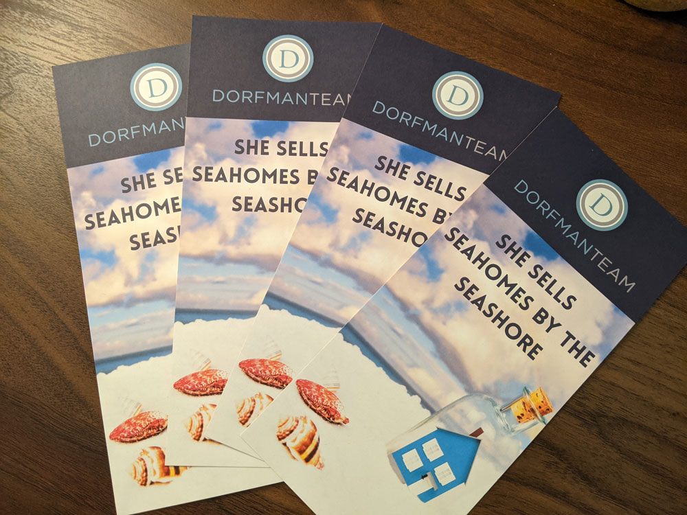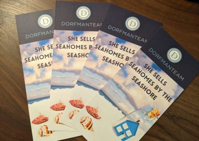 Spark + Buzz got the chance to flex our creative muscles to spark some buzz amongst The Dorfman Team’s referral partners. To help tell this story, the first component was to create the messaging and rack card content. She Sells Seahomes by the Seashore was launched complete with a canvas swag bag filled with Sun Bum sunscreen, lotion and lip balm, salt water taffy and Dorfman Team branded beach balls. Each tote bag was affixed with a hand-written note and delivered directly to doorsteps in Maryland, Virginia and Washington, D.C. The rack cards were designed to peek out of the tote bag’s front pouch, while printed extras were used for subsequent mailers.